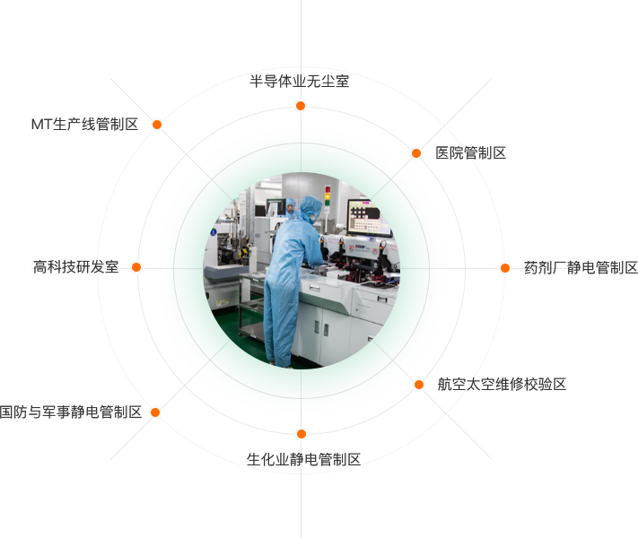 MT生產(chǎn)線管制區(qū)、半導(dǎo)體業(yè)無塵室、高科技研發(fā)室、國防與軍事靜電管制區(qū)、爆裂物處理區(qū)、航空太空維修校驗(yàn)區(qū)、藥劑廠靜電管制區(qū)、醫(yī)院管制區(qū)、生化業(yè)靜電管制區(qū)…以及其他需防靜電測試防護(hù)之場合